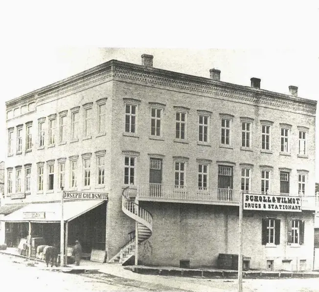 Noted as the Michael Weyker Building, it was originally a three-storied building from 1867-1875. The building housed businesses like Scholl & Wilmot Drugs and Stationery, the Joseph Goldsmith Store, and Glaesner Amusement Parlor and Saloon. In 1875 Kemp Malt Co. reduced the building to two stories and a rear addition was added. The 1900 phone directory lists the occupants as A.H. Kuhl & Co.: Gents furnishings, candies and etc., and Kukl & Leek: Bicycles. Kraus and Grau Hardware Store occupied the building in 1901. Later other businesses included Schmit Appliance, Biever Appliance Store, Home Port Designs and an antique store.